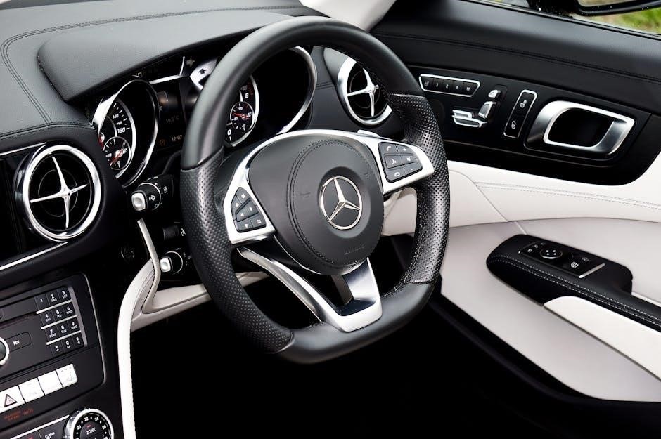 Safety and warning symbols in Mercedes vehicles indicate critical system statuses or potential hazards. These lights alert drivers to issues like airbag malfunctions, seatbelt reminders, or brake system warnings. Examples include the airbag warning light, which illuminates if there’s a problem with the airbag system, and the electronic stability control (ESC) light, which signals issues with traction or stability systems. These symbols are designed to ensure driver and passenger safety, prompting immediate action to prevent accidents or system failures. Ignoring these warnings can lead to severe consequences, making it essential to address them promptly. Always refer to the owner’s manual or a Mercedes dashboard symbols PDF guide for accurate interpretations.